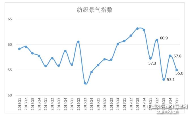 2019年一季度,受到国内外市场需求疲弱,企业生产安排受春节假期等因素影响波动较大,我国纺织行业生产增速有所放缓。一季度生产指数仅为55.5,较2018年四季度下降5.1个点,均低于2018年一、二、三、四季度同项指数。