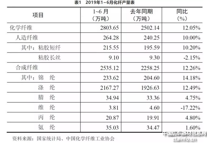 据国家统计局统计,1~6月化纤产量2803.65万吨,同比增长12.05%。其中,涤纶、锦纶和粘胶短纤三大类产品的产量增速均超过10%。但据协会抽样调查统计分析,增速约在8%。