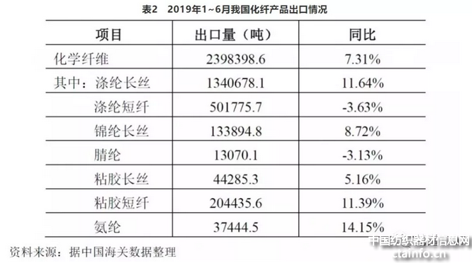 从化纤出口方面来看,1~6月,我国化纤出口240万吨,同比增长7.31%,增速比上年同期提高0.43个百分点。但受中美贸易战的影响,我国对美出口化纤同比减少37%,占出口总量比例下降3.4个百分点。