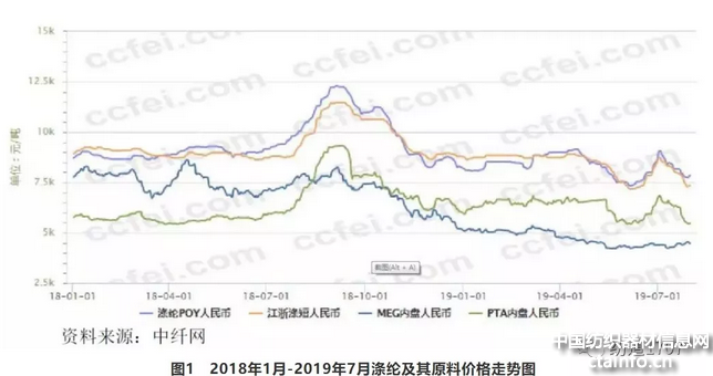 以涤纶为例,市场在经过去年四季度的大幅下跌之后,有反弹的意愿,同时国际原油价格上涨形成成本端的支撑,1~4月,市场小幅走高,但无奈需求低迷,5月中美贸易战压力加大导致化纤市场各类产品价格快速下跌,恒力炼化项目投产加大了涤纶下跌的深度。6月价格降至低位,下游逢低买入促使市场成功触底,随着G20会议后贸易战重新缓和,形成一波短期的上涨行情。但需求并没有实质性的好转,7月,价格又回归基本面进入下跌通道。