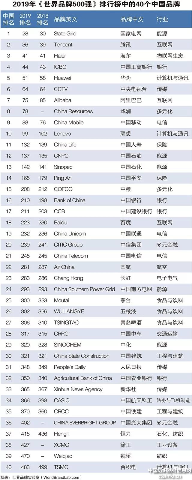 由世界品牌实验室(WorldBrand Lab)独家编制的2019年度(第十六届)《世界品牌500强》排行榜于12月11日在美国纽约揭晓。中国入选的品牌有40个