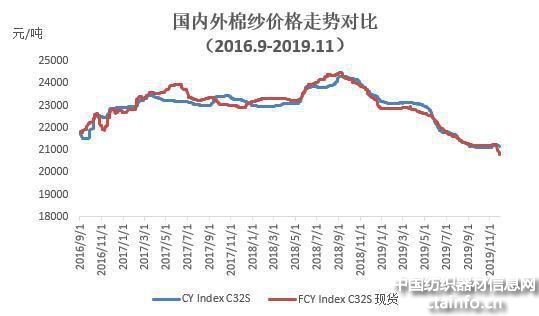 本月国内棉纱价格略有上涨,而进口棉纱价格继续下跌。据调查,国产32支纯棉纱11月均价为21185元/吨,较上月上升73元/吨,涨幅0.35%,较去年同期下跌2583元/吨,跌幅10.87%;进口32支纯棉纱月均价为21171元/吨,较上月下跌21元/吨,跌幅0.1%,较去年同期下跌2516元/吨,跌幅10.6%。
