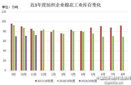 11月份,受中美贸易磋商进展影响,纺织市场上半月延续10月份的回暖趋势,棉花采购力度加大,但下半月行情转淡,市场恢复疲软状态。据中国棉花预警系统对全国90余家定点纺织企业调查显示,纺织企业原料库存上升,纺织品产量环比略增,纱线库存稳中略增,布的库存上升。