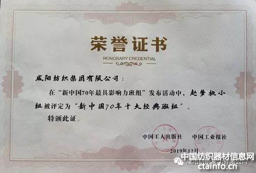 由中国工人出版社、中国工业报社共同主办的“新中国70年最具影响力班组”评审活动中,咸纺集团公司一分厂赵梦桃小组在全国近千家小组中成功入选,被评为“新中国70年十大经典班组”,并受邀参加了在北京举行的“新中国70年最具影响力班组”发布仪式暨第一届新时代班组高峰论坛。