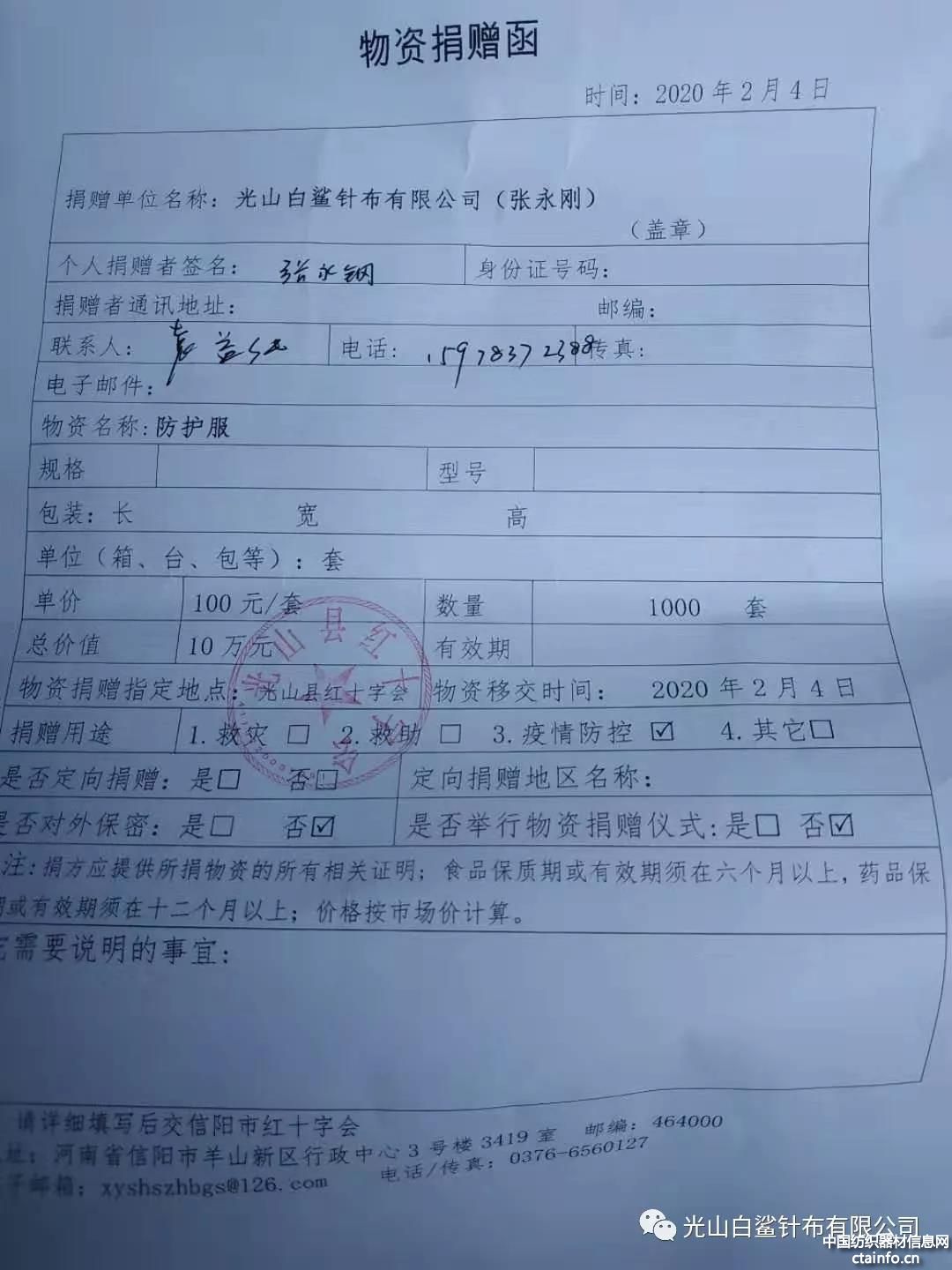 自疫情爆发以来,多家医院的防护资源严重短缺,前线告急,急需口罩、防护服、护目镜等等。光山白鲨针布有限公司董事长张永刚在一周内,通过纺织行业协会、同行厂家、非织造布单位等各种渠道,多处联系,层层闯关,星夜疾援从外地紧急购进连体防护服1000套,价值10万元捐赠给光山县红十字会。