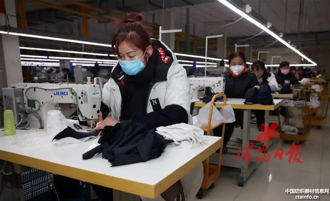 2月5日在陕西咸阳杜克普服装有限公司生产车间三到五人的各生产小组正在全力紧张地进行流水线生产作业。