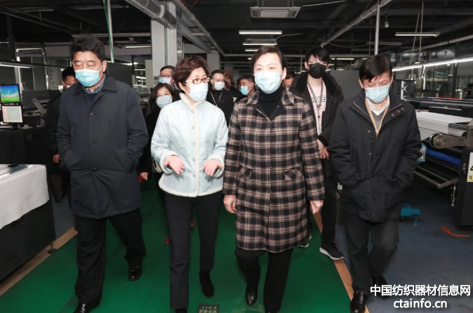 万事利开启复产复工加速度。图为王文序副省长、柯吉欣副市长参观万事利双面数码印花车间