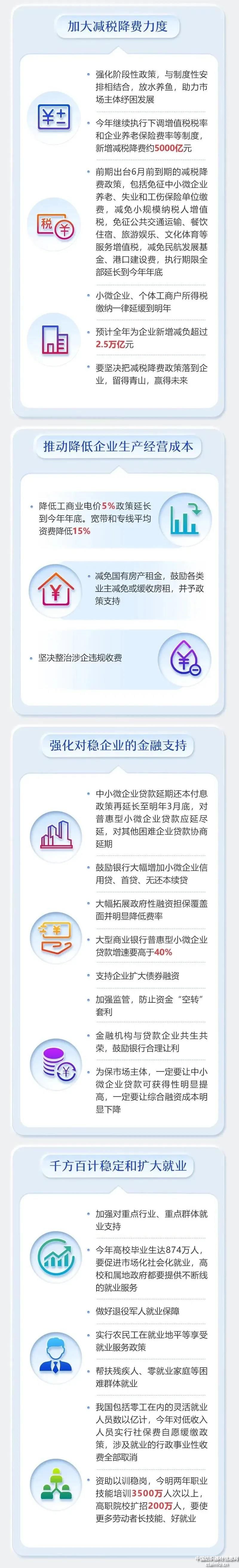 报告中多次提及就业、减税降费等与民生相关的问题。保障就业和民生,必须稳住上亿市场主体,尽力帮助企业特别是中小微企业、个体工商户渡过难关。