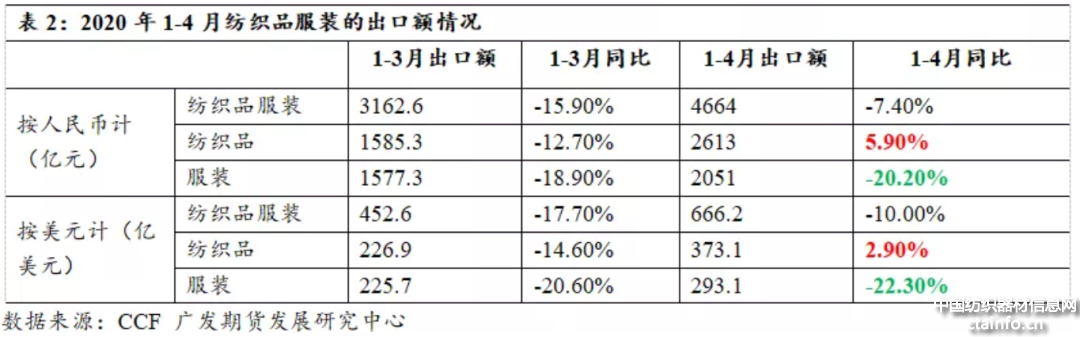 然而,在聚酯去库的当前,实际需求依旧处于堵塞状态。一方面终端加弹、织机4月整体开工就不高,备货的原料库存消化少;另一方面生产的成品,不管是内贸还是出口,在纺服上的需求依旧同比下降明显(口罩等物医疗资需求对涤纶需求环节的带动较为有限)。根据海关总署发布的数据,今年1-4月纺织品服装的出口额情况。