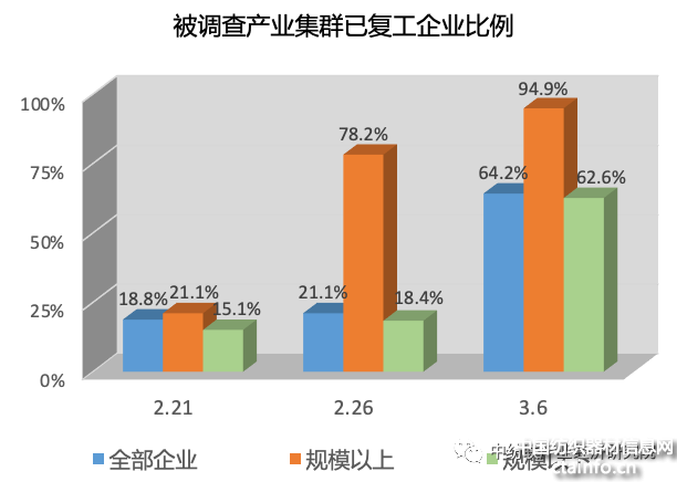 小微企业复工复产情况好转。28个重点产业集群内共有4.5万户规模以下企业实现复工,占集群规下企业总数的比例达到62.6%,较上周调查数据提高了40多个百分点;规下企业已复工人数达到62.6万人,占正常情况用工人数比例为48.4%。但与集群规模以上企业相比较,小微企业复工进度仍然相对偏慢。