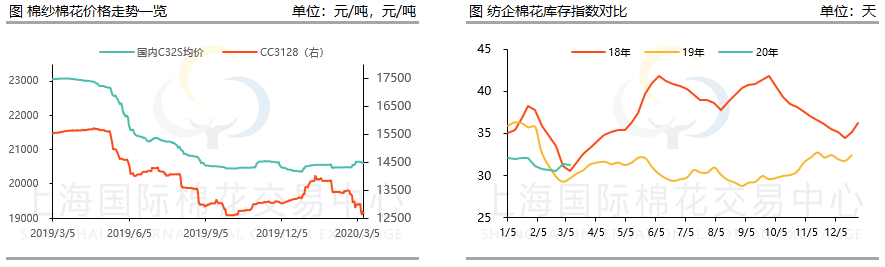 从棉花原料来看,由于前几日沙特打响原油价格战加上近期海外疫情呈几何式爆发的影响,全球大宗商品都在“跌跌不休”中。2月21日以来,郑棉累计下跌1300元/吨~1500元/吨。2月21日,郑棉主力收盘价13265元/吨,短短一周,截至2月28日下跌至12180元/吨。下跌了整整1000元以上。3月13日郑棉开盘价直接跌破12000元/吨大关,收盘于11775元/吨。紧接着期货,现货跟着同步下跌。另一方面,受疫情影响,新疆棉的移库、销售都受到了很大限制。受原料影响,棉纱价格也难以提涨。对于纺企而言,原料库存风险也越来越大,据了解,眼下多数纺企原料为年前备货,且多数库存在1个月左右水平,折算成本已无利可图。企业现在大多已经放弃了“金三银四”的幻想,采取以销定产、现金为王的原则。