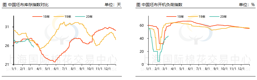 从下游坯布行情来看,与往年的开机负荷相比,今年开机负荷指数明显偏低,截至当前坯布开机负荷指数不足五成,且恢复速度也有明显下降。究其原因主要在于各地轻纺城市场虽然陆续开市,但多数门可罗雀,部分织厂多考虑订单及库存转移等因素控制织厂开机。另一方面部分织厂虽已复工多日,但外地员工较多,部分员工仍未返岗,造成无法开机。而从库存来看2020年织厂复工后库存下滑显著,由于疫情造成复工延期,下游客户多催促织厂交货。但同样的,织厂也面临着新订单不足的压力,市场信心较年前有所回落。