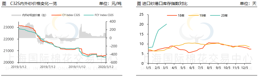 近期,进口纱的特点是:价格整体下跌,且内外呼应价格齐跌。据贸易商透露,受疫情在全球扩散影响,市场采购情绪不高,价格整体偏弱,买家多逢低价下单,遇高价则退避三舍。截至3月12日,FCY Index C32S折人民币现货价报收20457元/吨,较上周下跌12元/吨。目前,疫情已在全球扩散,且破坏力惊人。业界对2020年上半年经济运行的评估大多持非常悲观的态度,甚至感觉全球经济都有停摆的风险。在这样的背景下,生产厂家、贸易商之间都是愁云惨淡,纷纷去库存变现尽快逃离市,进口纱库存也上升到了前所未有的高度。