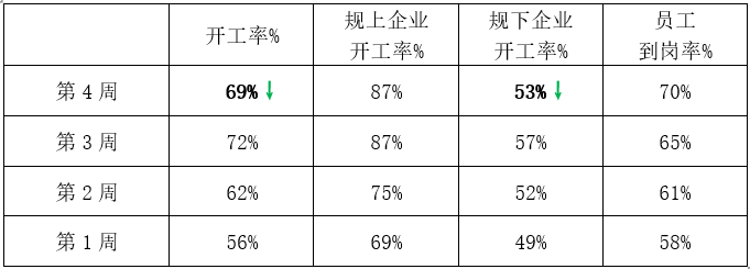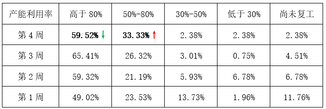 3)从人员到岗情况看,集群企业人员平均到岗率在70%左右,较前一周同比提升5个百分点。随着市场需求减弱,部分企业生产的人员轮流上岗,由三班改为两班或一班。