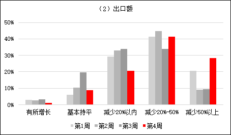 调查显示,在对2020年第一季度的销售收入、出口情况进行的预判中,销售收入方面,认为一季度会较去年同期减少20%以内的企业占比最高;出口情况中,认为一季度会较去年同期减少20%~50%的企业占比最高,认为减少50%以上的企业占比增幅最大,如图3所示。随着第一季度的结束,出口额降幅明显已成事实,出口市场压力较大。