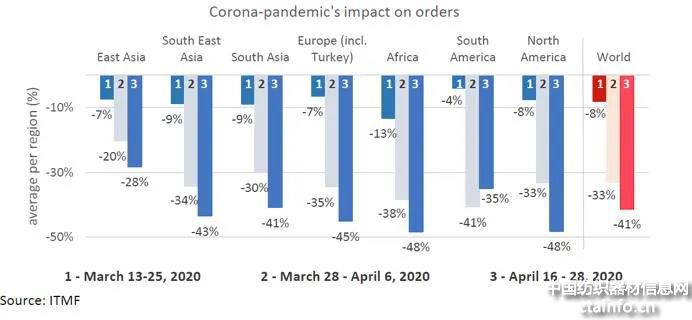 值得注意的是,东亚地区的订单降幅为28%,明显低于其他所有地区(41%及以上)。可以假设,这个地区首先受到新冠疫情带来的影响,也首先从危机中恢复。特别是中国和韩国成功地控制了疫情,在过去的几周里,大多数中国纺织企业都大幅提高了产量。同时,线下零售店也重新开张,东亚国家的消费开始逐步恢复。但是消费情况将如何变化,还有待进一步观望。