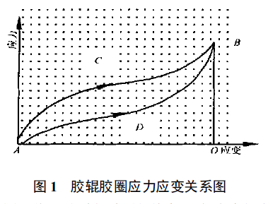 图1 说明:当胶辊胶圈拉伸变形时, 应力与应变沿ACB 线增长, 回缩时沿BDA线减弱, 从能量守恒的原理可知:胶辊胶圈拉伸时外力所做的功等于胶辊胶圈回缩时所做的功和运动过程中损失的功, 在图中的反映也就是面积SACBO=SBDAO +SCBDA。所以, 橡胶的内耗会导致胶辊胶圈在频繁的高变力作用下产生弹性下降, 随着纺纱速度的加快, 交变压力频率增加, 橡胶硬化明显,分子链松驰时间越来越多,滞后影响越来越大, 内耗逐渐增大, 这样不仅胶辊胶圈的弹性破坏, 而且老化程度进一步加快, 也就是我们在生产过程中见到的胶辊胶圈使用寿命短,回磨周期短, 胶辊在高速运动中易龟裂、变形, 纺纱过程中胶辊胶圈起痕、凹陷等。缩短滞后时间, 减少内耗是延长胶辊胶圈使用寿命和提高纺纱质量的关键。