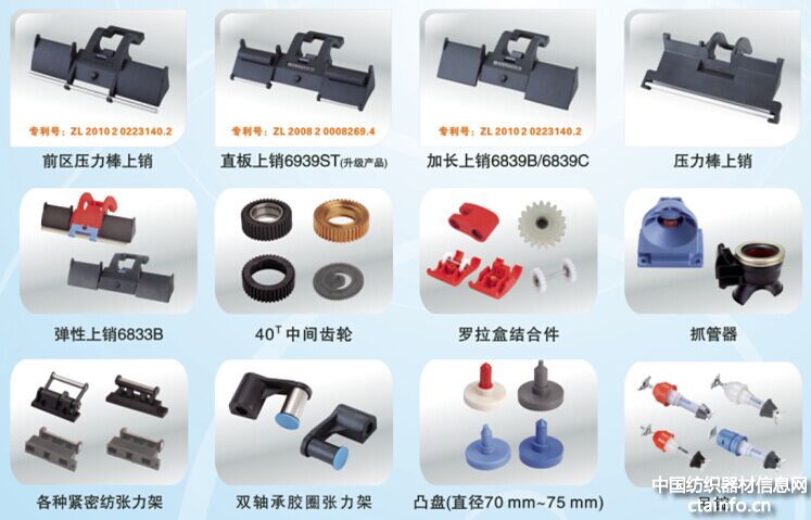 余姚精鸿 余姚市精鸿纺机专件有限公司是一家专业研制开发并生产各类新型纺织器材的企业,本次展会上携旗下多款产品亮相。主要展出的产品有毛刷、上销、抓管器、压力棒隔距块、吊锭、紧密纺张力架等,其中新型前区压力棒上销这一专利产品,采用不锈钢精工制作而成,装卸方便,减小了浮游区空间,使浮游区纤维得到有效控制,可使CV值下降1.5%以上。