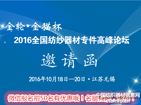 “金轮•金猫杯”2016全国纺纱器材专件高峰论坛将于2016年10月18日—20日在江苏无锡召开。会议是由中国棉纺织行业协会、全国纺织器材科技信息中心和《纺织器材》杂志社共同举办的。