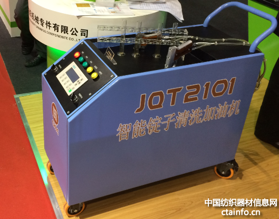 经纬专件在不断探索新型锭子的研发过程中,同时加大了对辅助工具的研发,研制出JQT2101型智能锭子清洁加油机,其特点是:省力,油枪一键触发即可完成加油或清洁工作;定量,采用定量加油方式,出油量设定简单、准确性高,加油的准确率为0.5 ml;方便:电源采用锂电池,蓄电池效能可达到连续加油大于2 400锭,现场不需要拖电线,设备移动方便,现场安全整洁;智能:采用PLC控制,根据需要编程加油程序;低耗:低能耗油泵,间歇性工作;效率高,一套锭子的清洁工作时间不超过1 s,一套锭子的加油工作时间不超过1 s。
