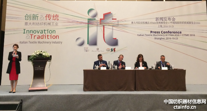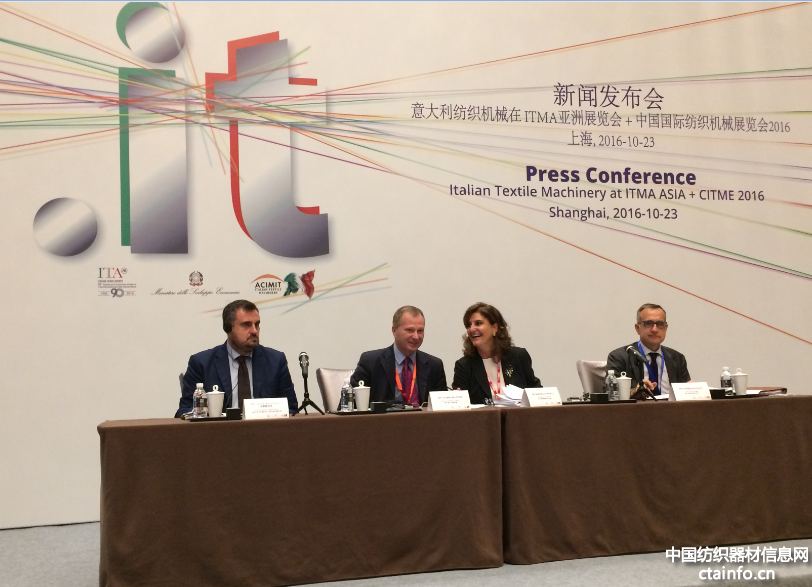 2016年10月23日上午,意大利纺机协会及意大利对外贸易委员会在国家会展中心(上海)洲际酒店召开媒体新闻发布会,展示了意大利高端技术的创新性与持久性,意大利驻上海总领事Stefano Beltrame先生、意大利对外贸易委员会上海代表处首席代表Claudio Pasqualucci先生、意大利纺机协会主席Raffaella Carabelli女士,意大利纺机协会主任Federico Pellegata先生分别进行了致辞。
