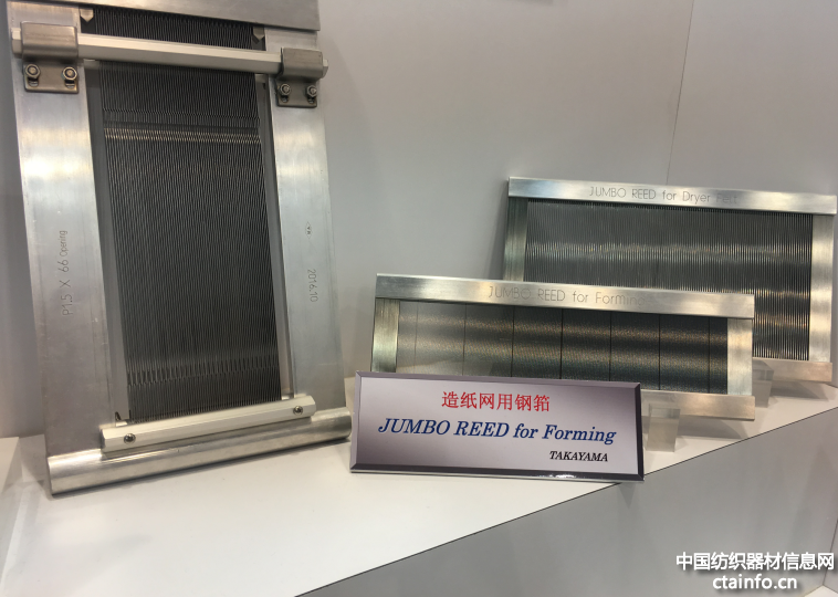 此外,高山纺器还展出了其系列钢筘产品,如异型筘、平齿形钢筘、圆针型钩筘、造纸网用钢筘等。