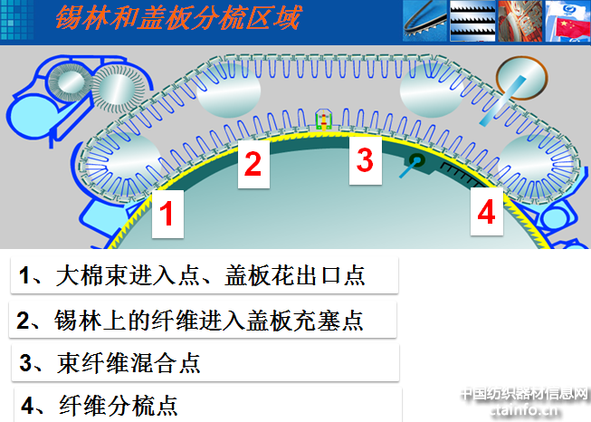 1.锡林上的纤维转移到盖板针布;2.盖板上的纤维转移到锡林针布表面;3.棉结、杂质、短纤维分离排除。