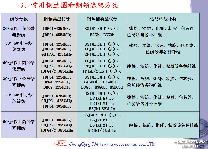 王总列举了4个不同纺织厂、纺不同号数、不同品种纱、选配不同型号的钢丝圈钢领,均可达到企业的生产要求,成纱指标达到企业内控标准。