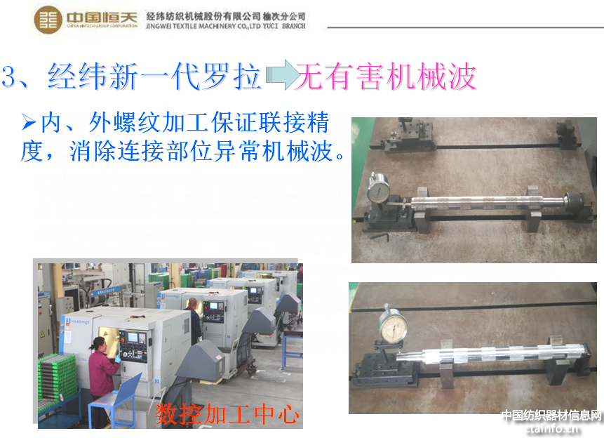 经纬罗拉的加工流水线全部实现自动化,并对加工工艺进行了改进,如由多次外圆磨床加工,改为采用进口成型磨加工一次成型,保证基准一致。专用仪器检测齿形,定期在细纱机短车试纺后经公司乌斯特条干检测仪对机械波状况与条干水平进行检测。