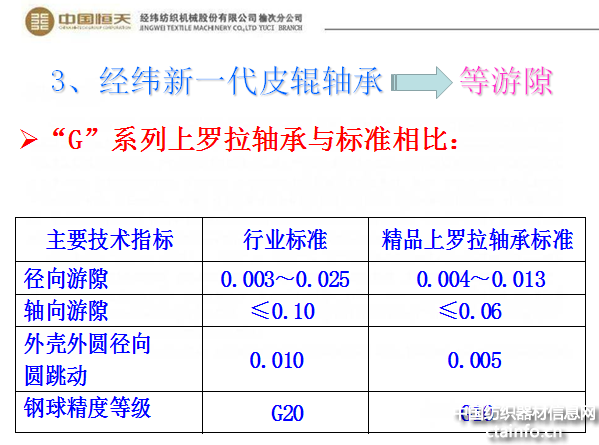 等游隙对磨砺胶辊、一致性起到关键作用,改善纺纱条干指标一致性。推出G系列胶辊轴承,采用优质轴承钢材料,轴承沟道超精加工,平稳,寿命长。