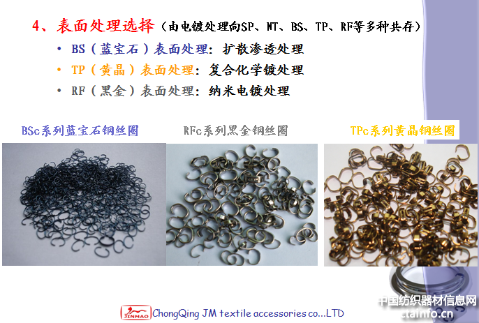 1) 材料选择方面:国产材料与进口材料并存:① T9A材料:杂质含量高,仅用在普通电镀钢丝圈、SP、NT;② 优质合金材料:BSb系列(80WV合金材料);③ 高碳优质合金材料:BSd系列(轴承钢材料);④ 进口的高碳优质合金材料:BSc系列、TPc系列、RFc系列。