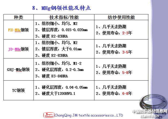 高精密钢领(MHg):新钢领表面粗糙度好,没有走熟期,摩擦因数小,钢领在短暂的磨合期内,钢丝圈号数的选择原则:① 配BS、TP、RF等高精密钢丝圈可以加重1~2个号;不能按传统方法减轻1~2个号,因为高精密钢领(MHg)摩擦因数小。② 如果配普通电镀钢丝圈,则按正常号数或减轻1个号;普通钢丝圈表面摩擦因数比高精密钢丝圈要大一些。