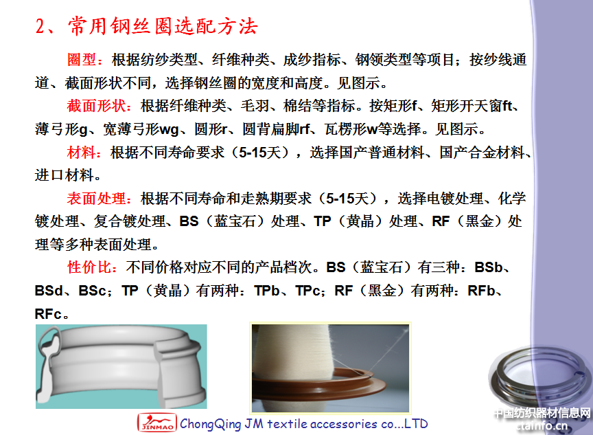 普通钢领或普通电镀钢领:新钢领表面粗糙度较好,有短暂的走熟期,钢领在短暂的磨合期内,钢丝圈号数的选择原则:① 普通钢领配普通钢丝圈就需要减轻1~2个号,以便走熟期内钢领和钢丝圈之间的有效磨合;② 配BS、TP、RF等高精密钢丝圈可以不减轻号数,有时还需要加重1个号,因为这种钢丝圈表面摩擦因数小。
