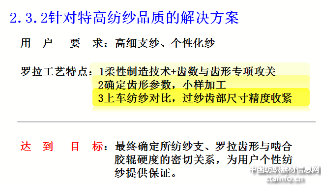 目前,中高端用户在配置使用经纬成熟、高品质罗拉外,逐步在体验、试用各类特殊锭距、齿面异型、特殊联接、特制配合的罗拉。下一步,将对材料进行深入研究和处理,开发罗拉专用智能检测系统,加工制造精度高的三元色纺、二元色纺喂入后罗拉,积极参与行业标准的制定。