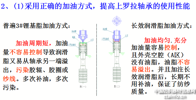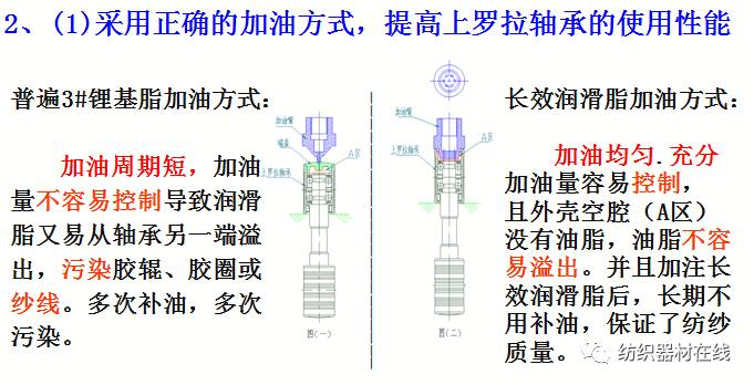 为降低维护保养成本,推广长效润滑脂应用于上罗拉轴承,使高品质上罗拉轴承性能得到充分发挥。长效润滑脂具有长寿命、防腐蚀、高负载、防水、抗磨损等优良性能,加油周期长达近7万工作小时或8年,大大减少补油工作量。