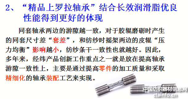 经纬上罗拉轴承针对市场发展要求,提高产品质量的一致性,尤其是轴承游隙的一致性,保证纺纱质量;提高产品质量的稳定性,保证轴承使用寿命;推广可降低维护保养成本、降低能耗的产品;扩大产品品种,满足不同机型、不同纺纱的要求。