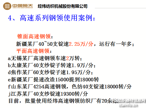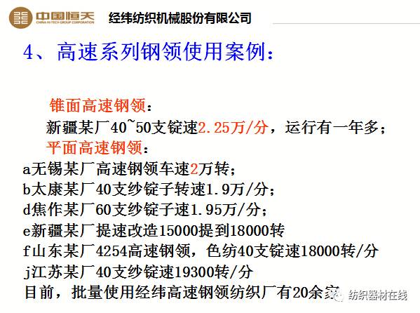 对标国外产品,采用优质材料,钢领跑道涂层厚度15 μm以上,硬度约为1050 HV。经纬高速钢领可比业内其它精密钢领提升500 r/min~1000 r/min,使用寿命达5年以上(一定条件)。目前,批量使用经纬高速钢领纺织厂有20余家,适宜高速纺纱,降低纱线毛羽。