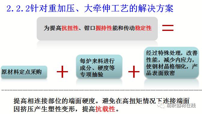 大牵伸、大卷装、重加压、高速的特殊工艺要求,使得罗拉扭距与承载增加,内部组织结构与性能发生改变,造成运转过程中罗拉缩短无法拆卸以及车头车尾同步不丢转、产生开关车粗细节及留头率低、不同步等问题,提出了针对特殊工艺的解决方案。