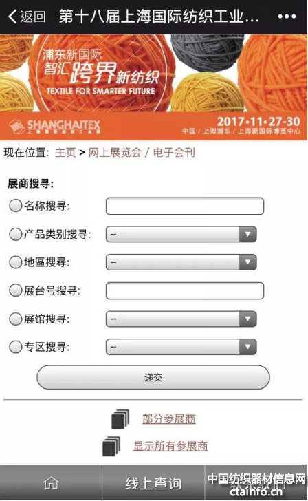 为了让大家尽早于展前了解各参展商及展品,好好规划2017年11月27至30日的观展行程,上海纺机展现已正式推出全新网上展商列表!