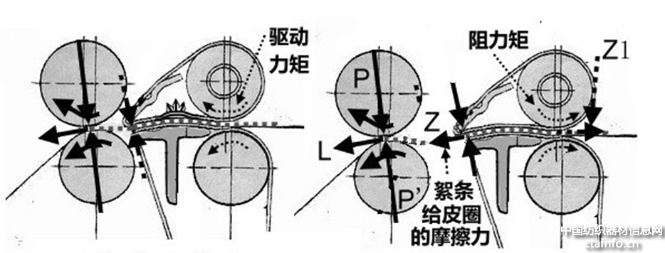 再来观察在有纤维絮条的情况下的实际传动状态;罗拉和胶圈之间一般认为是罗拉主动,是罗拉带着胶圈前进。但是现在的结构设计,胶圈的牵伸工作面是“松边”,迫使上胶圈向上起拱(下图左);要使胶圈牵伸工作面紧密接触,必须使它变成“紧边”,那么唯一的办法是把传动方式颠倒过来,即胶圈作为主动件,“传动”罗拉。那么这个原动力何来?来源就是在上销压力点上絮条的摩擦力。